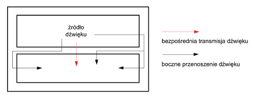 Boczne przenoszenie dźwięku jest for­mą transmisji energii akustycznej z po­mieszczenia ze źródłem dźwięku do in­nych pomieszczeń budynku wszystkimi drogami poza bezpośrednią przegrodą dzielącą te wnętrza. Zwykle odbywa się to poprzez elementy konstrukcyjne budynku (rys. 3). Rozprzestrzeniające się w konstrukcji dźwięki materiałowe są wyjątkowo trudne do stłumienia, gdyż straty takiego przewodzenia są niewielkie. W przypadku belek drew­nianych, ceglanych lub betonowych drgania podłużne są tłumione tylko o  2 dB na długości 30 m. To samo tłu­mienie w stali występuje na odcinku dwa razy dłuższym.