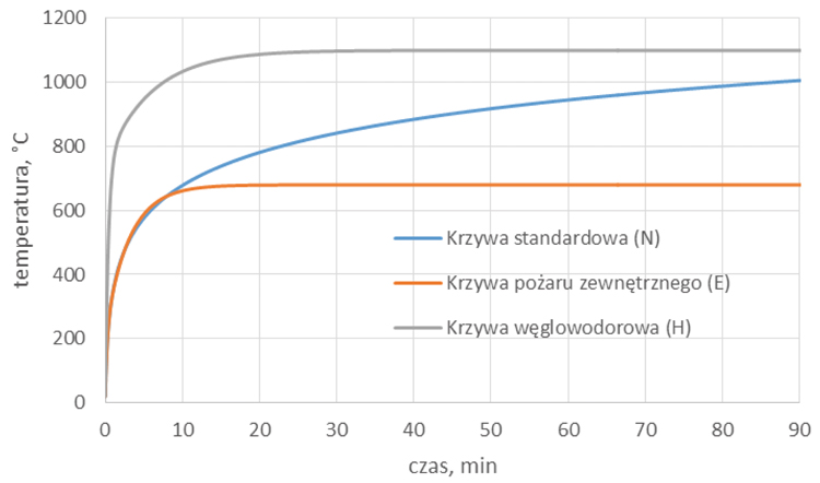 W procesie projektowania budynku zarówno pod kątem bezpieczeństwa budowli, jak i zachowania instalacji i urządzeń elektrycznych w trakcie pożaru niezbędne jest odniesienie się do modelowego przebiegu zmian temperatury w czasie. Określa się tzw. krzywe pożarowe stanowiące punkt odniesienia dla projektantów (PN-EN 1363-2). Przebieg pożaru będzie jednak zależny od miejsca pożaru, geometrii, warunków wentylacji czy rodzaju spalającego się materiału. Zdefiniowano zatem kilka krzywych pożarowych: