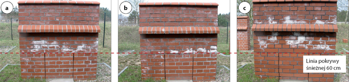 Fot. 1. Koncentracja wykwitu powyżej powierzchni pokrywy śnieżnej zarejestrowana po pierwszym sezonie zimowym – stanowisko in situ badań murów licowych: a) zaprawa cementowa; b) zaprawa cementowo-wapienna; c) zaprawa systemowa z dodatkiem trasu (opracowanie własne)