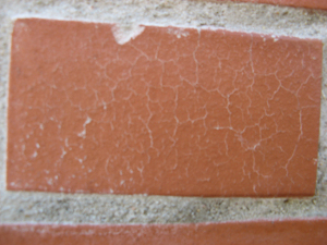 Fot. 3. Przykład niszczącego skutku krystalizacji rozpuszczalnych soli mineralnych w klinkierze, stanowisko in situ badań murów licowych (fot. autor)