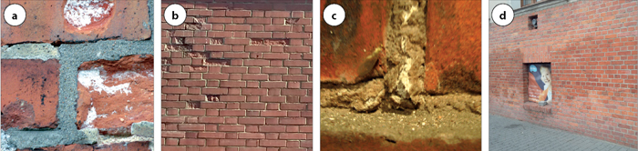 Fot. 4. Degradacja muru: a) soczewki i skupienia zbudowane z kryształów solnych; b) zniszczenie warstwy licowej – powierzchnia jest spulchniona i daje się łatwo odspajać za pomocą ostrego narzędzia; c) łuszczenie powłok, takich jak farby, powłoki hydrofobizacjne powierzchniowe, oraz depozyty zanieczyszczeń powierzchniowych; d) wilgoć wznosząca, w której sole mogą być rozpuszczane i transportowane przez wodę, aby następnie krystalizować w odpowiednich strefach muru. Zjawisko to szczególnie dobrze jest zauważalne w strefach oddziaływania środków odladzających