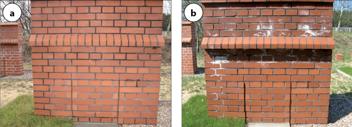 Obszarowe zawilgocenia w obrębie zwieńczeń, nadproży i gzymsów są efektem utraty integralności muru. Za integralność muru odpowiedzialna jest przede wszystkim zaprawa murarska, której głównym zadaniem jest zapewnienie spójności w obrębie połączenia z elementem murowym [11]. Spójność muru może być naruszona na skutek popełnionych błędów: