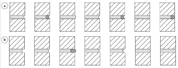 Rys. Przykłady rozwiązań kształtu spoin i fug w murze licowym: a) prawidłowe wyprofilowanie spoin i fug, b) nieprawidłowe wyprofilowanie spoin i fug [1], [10]