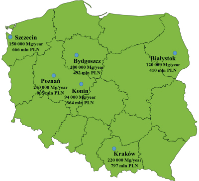 Wobec terminowo wymaganych etapów realizacji projektów budowy spalarni nie wszystkie zaplanowane w 2007 r. projekty sprostały wymaganiom. Powstało w ten sposób miejsce dla innych projektów. Udało się sprostać wymaganiom i wykorzystać tę szansę regionowi położonemu wokół Konina. Ostatecznie realizację podjęto dla sześciu spalarni. Nazwy miast i regionów, w których podjęto ostateczną decyzję budowy spalarni oraz ich położenie geograficzne na mapie Polski, prezentuje rys. 1.
