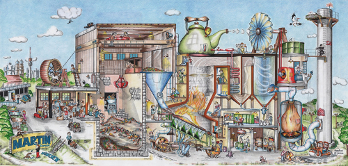 Rys. 2 Infantylnie zobrazowany proces termicznego przekształcania odpadów w technologii spalania na ruszcie (szkic wg praw autorskich firmy Martin GmbH)