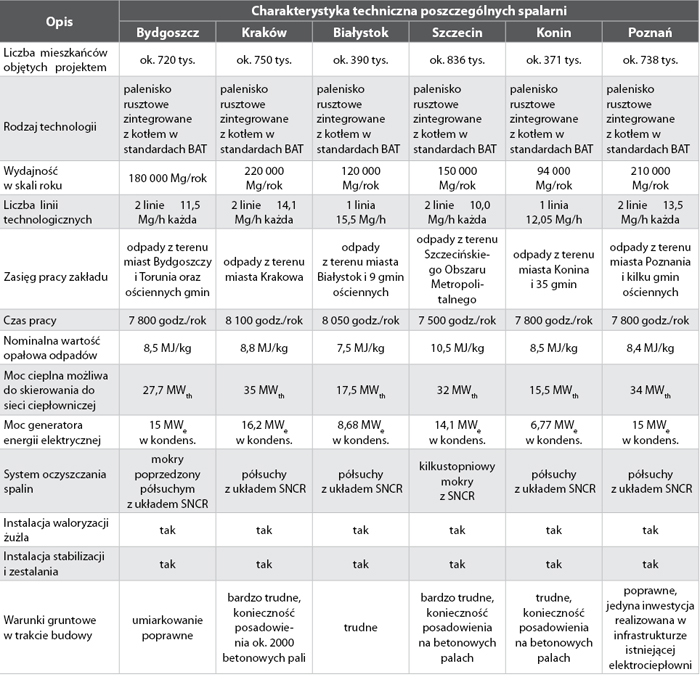 Tab. Zestawienie podstawowych cech i parametrów nowych polskich spalarni odpadów komunalnych