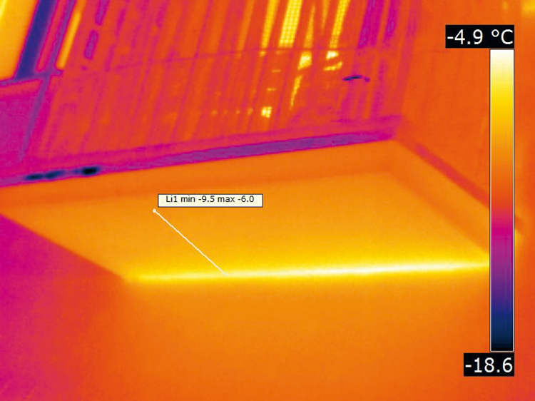 Rys. 2. Termogram płyty balkonu wspornikowego, widoczny mostek cieplny pod płytą balkonu