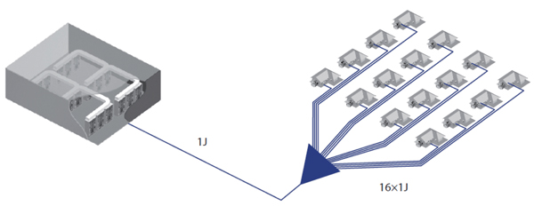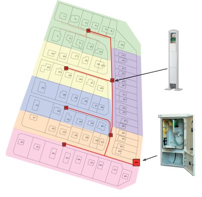 Dla sieci typu GPON, bazującej na architekturze P2MP, w relacji między centralą a osiedlem wystarczy przyłącze nawet na jednym włóknie, czasem na kilku pojedynczych włóknach (zależy to oczywiście od liczby domów, współczynnika podziału i wymaganego pasma). Szafa dostępowa w osiedlu musi mieć w tym wypadku możliwość umieszczenia wewnątrz pasywnego splittera optycznego.