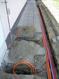Fot. 1 Przykład ułożenia mikrokanalizacji wzdłuż chodnika i odgałęziania kolejnych rurek do posesji (fot. Duraline)