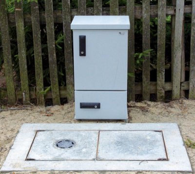 Fot. 3 Szafka uliczna pełniąca funkcję głównego punktu dostępowego dla osiedla domów jednorodzinnych. Obok widoczna studnia, z której wykonane jest przyłącze do kanalizacji operatora. Pokazana szafka PSB-H-72 o wymiarach 450x790x355 mm dostosowana do sieci P2MP w technologii GPON pozwala na umieszczenie splitterów optycznych i przyłączenie maksymalnie 72 abonentów (fot. FCA sp. z o.o.)
