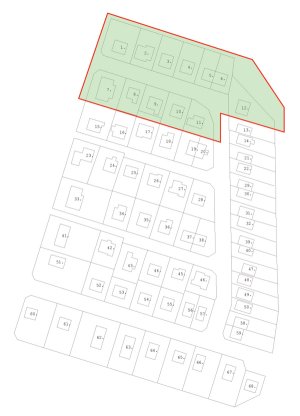 Rys. 3 Wyznaczenie pierwszego obszaru abonenckiego o liczbie użytkowników odpowiadającej pojemności pośredniego punktu dystrybucyjnego – tu przykładowo słupka ulicznego, do którego podłączonych zostanie 12 budynków