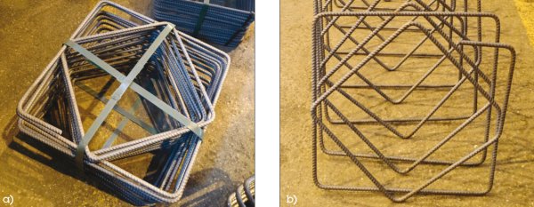 Fot. 11. Prefabrykowane zbrojenie w postaci dostarczanej na budowę (a) oraz przed wprowadzeniem do deskowania (b) (fot. G. Adamczewski)