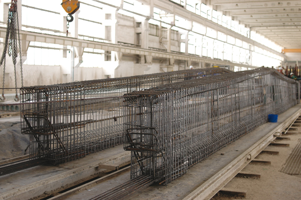 Zbrojenie zazwyczaj wykonywane jest w zbrojarni przy zakładzie prefabrykacji, skąd transportowane jest do hali prefabrykacji i umieszczane w formach. W przypadku niektórych elementów możliwa jest sytuacja odwrotna, kiedy najpierw dostarczane jest zbrojenie do hali produkcyjnej, a dopiero później składana jest forma kształtująca element (fot. 10). Interesującym rozwiązaniem jest produkcja półfabrykatów zbrojeniowych w wyspecjalizowanej wytwórni, co zmniejsza pracochłonność robót zbrojarskich (fot. 11).