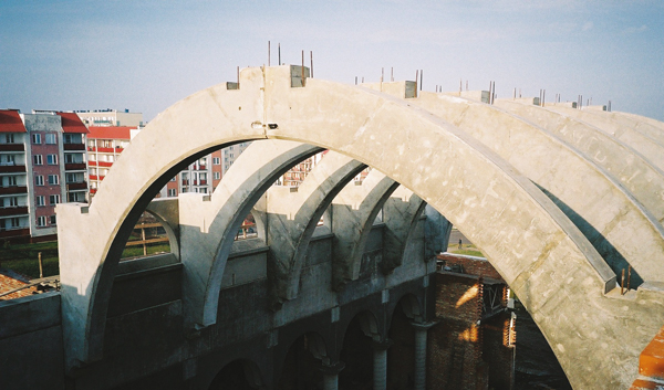Ciekawym przykładem zastosowania technologii prefabrykacji w budownictwie publicznym jest wykonanie nietypowej konstrukcji neobarokowego kościoła. We wspomnianym przypadku wykonano prefabrykowane żelbetowe dźwigary łukowe o rozpiętości do 12 m (fot. 3). Ze względów technologicznych największy dźwigar (o masie 32 t) nawy głównej został podzielony na dwa elementy. W konstrukcji kościoła wykorzystano również prefabrykaty innego rodzaju, między innymi do przekrycia łukowego sklepienia. Sklepienie zostało wykonane jako strop zespolony prefabrykowano-monolityczny w postaci łupin stropu filigran [5].