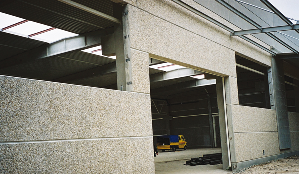 Dodatkowo w części spotykanych hal podstawowym elementem konstrukcyjnym są prefabrykowane ściany typu sandwich, wyposażone zależnie od wymagań w otwory okienne, drzwiowe lub też ich pozbawione. Dzięki warstwie ocieplenia elementy te charakteryzują się dobrą izolacyjnością cieplną. W halach o dużej rozpiętości oraz znacznych obciążeniach stropów bardzo często wbudowywane są płyty TT z żebrami o rozstawie 1,2 m. Wysokość żeber wynosi od 40 do 90 cm, a ich zastosowanie umożliwia redukcję liczby słupów pośrednich w obiekcie.