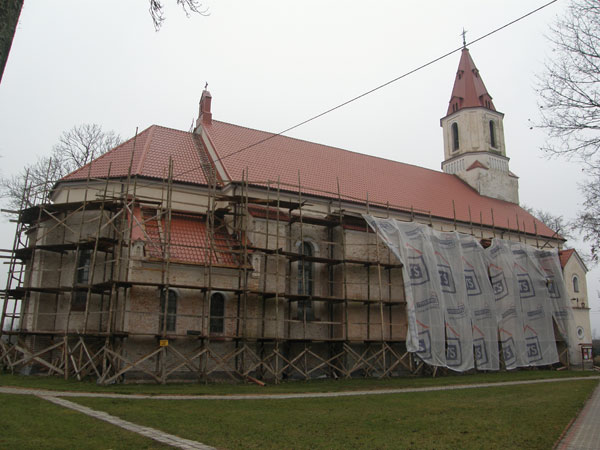 Fot. 2. W kościele pw. św. Antoniego Padewskiego w Niewodnicy Kościelnej obecnie trwają prace budowlane. W tym roku zabytkowy obiekt będzie mógł pochwalić się nową elewacją (fot. B. Klem)