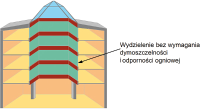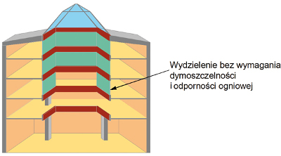 Kolejne atrium – zamknięte (rys. 2) – podobnie jak poprzednie jest wydzielone od pozostałych części obiektu, jednak przegrody wydzielające nie muszą być w nim ani dymoszczelne, ani odporne ogniowo.