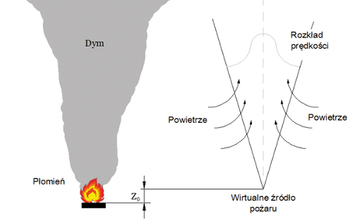 Mechanizm napływu powietrza zewnętrznego do kolumny konwekcyjnej dymu powstającej w czasie pożaru, decydujący o ilości tworzącego się dymu, został opisany w formie matematycznej m.in. przez Zukoskiego, Heskestada, Mc Caffreya, Thomasa [4]. Na rys. 5 przedstawiono model swobodnego słupa dymu według Heskestada, który został przyjęty jako wzorcowy w standardach brytyjskich i amerykańskich [3, 5]. Do słupa dymu ponad źródłem pożaru zasysane jest powietrze zewnętrzne, co powoduje wzrost jego objętości i obniżenie temperatury dymu. Oznacza to, że im wyżej od przewidywanego źródła pożaru zlokalizowane są punkty wyciągowe systemu oddymiającego, tym wydajność tego systemu musi być większa. Po przekroczeniu wysokości granicznej, zależnej od wielkości projektowej pożaru, wykonanie skutecznej instalacji oddymiającej staje się niemożliwe.