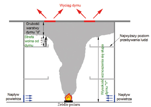 gdzie: Ce – współczynnik zasysania powietrza do słupa dymu w czasie pożaru, wynoszący: 0,19 [kg·s-1·m-5/2] – dla pomieszczeń, gdzie strop znajduje się w znacznej odległości od posadzki, np. posadzka atrium; 0,337 [kg·s-1·m-5/2] – dla małych pomieszczeń jak pokoje hotelowe, pokoje biurowe, małe sklepy itp. z otworami wentylacyjnymi z jednej strony; P -obwód pożaru [m]; Y – wysokość wznoszenia się słupa dymu [m]. Widać, że czynnikiem mającym największy wpływ na przyrost masy dymu powstającego w czasie pożaru jest wysokość wznoszenia się słupa dymu Y. Mierzy się ją od źródła pożaru do zakładanej wysokości dolnej granicy warstwy dymu. Wynika stąd, że im niżej przyjęta zostanie dolna granica warstwy dymu, tym mniej dymu będzie powstawało i co za tym idzie – mniejsza będzie wymagana wydajność instalacji oddymiającej. Należy pamiętać, że zawsze musimy ją przyjąć na wysokości co najmniej 1,8 m ponad najwyższym poziomem przebywania ludzi. Wielkość projektową pożaru (obwód P i moc konwekcyjną Q)przyjmuje się w zależności od przeznaczenia atrium i ilości materiałów palnych występujących na jego posadzce, a także od przewidywanego czasu rozpoczęcia działań gaśniczych przez najbliższą jednostkę straży pożarnej. Zwykle nie uwzględnia się instalacji tryskaczowej, nawet jeżeli jest ona zainstalowana pod świetlikiem atrium, ponieważ najczęściej jest ona na tyle wysoko, że nie ma gwarancji jej zadziałania.