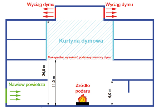 Opisane zjawiska, zachodzące w czasie przepływu dymu, dają odpowiedź na pytanie – dlaczego ochrona otwartych na atrium dróg ewakuacyjnych poprzez usuwanie dymu przez otwory w zadaszeniu pasażu jest możliwa w atriach otwartych tylko w przypadku, kiedy są one niskie, a w atriach wyższych tylko zamkniętych lub częściowo otwartych. W takich atriach różnica poziomów między projektową podstawą warstwy dymu (znajdującą się zawsze na poziomie najwyższej otwartej kondygnacji) a źródłem pożaru jest stosunkowo niewielka, a co za tym idzie ilość dymu wpływającego do zbiornika dymu jest jeszcze na tyle mała, a temperatura na tyle wysoka, że możliwe jest jego odprowadzenie przez klapy dymowe lub za pomocą wentylatorów oddymiających, zabudowanych w górnej części atrium.
