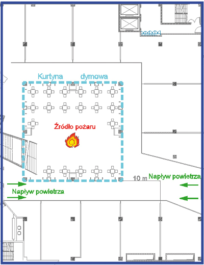 Procedura obliczeniowa zakłada scenariusz pożaru na posadzce atrium i pozwala określić wymaganą wydajność wentylatorów oddymiających bądźpowierzchnię klap dymowych.