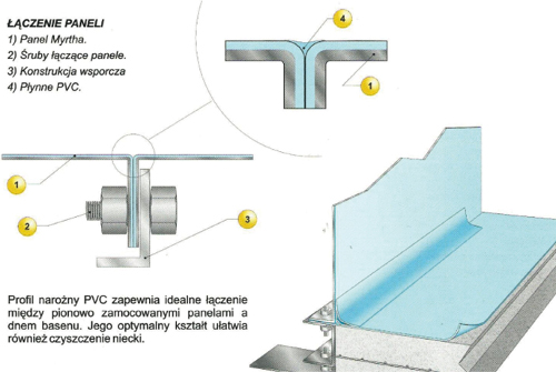 Na każdym etapie montażu niecki za pomocą galwanizowanych wsporników istnieje możliwość korekcji ustawienia paneli zarówno w pionie, jak i w poziomie. W miejscu styku połączeń paneli od wnętrza basenu nakładana jest warstwa płynnego PVC jako elementu łączącego panele ze sobą oraz folią płyty dennej. Połączenie takie zapewnia 100-procentową szczelność niecki basenu.