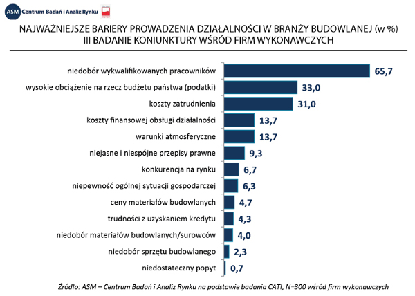 Problem związany z niedoborem wykwalifikowanych pracowników jest tak poważny, że pojawia się wśród najważniejszych barier w prowadzeniu działalności gospodarczej w sektorze budowlanym, co potwierdza firma ASM – Centrum Badań i Analiz Rynku, która na bieżąco monitoruje rynek pracy.